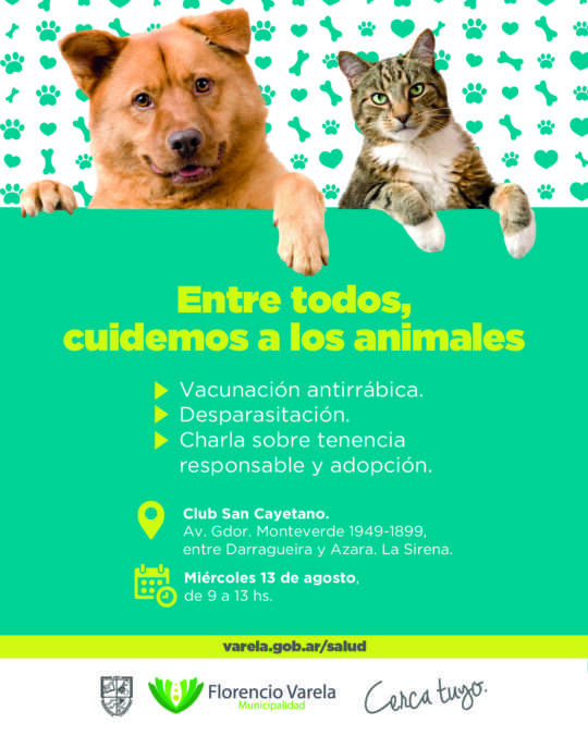 La jornada de vacunación, desparasitación y charlas sobre tenencia responsable organizada por la Comuna tiene nueva fecha: el próximo miércoles 13 de agosto, de 9 a 13 hs., en el Club «San Cayetano», situado en Av. Gobernador Monteverde, entre Darragueira y Azara.