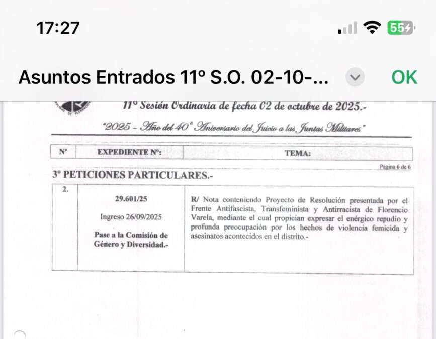 Desde el Frente Antifascista, Transfeminista y Antirracista de Florencio Varela queremos expresar nuestra profunda preocupación ante la inacción del Honorable Concejo Deliberante, que hasta el día de hoy, no ha tratado el Proyecto de Resolución que presentamos el pasado el pasado 26 de septiembre, con Nro de Expediente 29.601/25 y que ha sido pasado a la Comisión de Género y Diversidad.