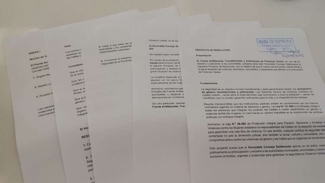 Presentación El Frente Antifascista, Transfeminista y Antirracista de Florencio Varela, en uso de su derecho a peticionar a las autoridades, presenta ante este Honorable Concejo Deliberante el siguiente Proyecto de Resolución, con el objetivo de que el cuerpo se pronuncie y actúe frente a la grave situación de violencia, femicidios, narcotráfico y asesinatos que afectan a la comunidad de Florencio Varela.
