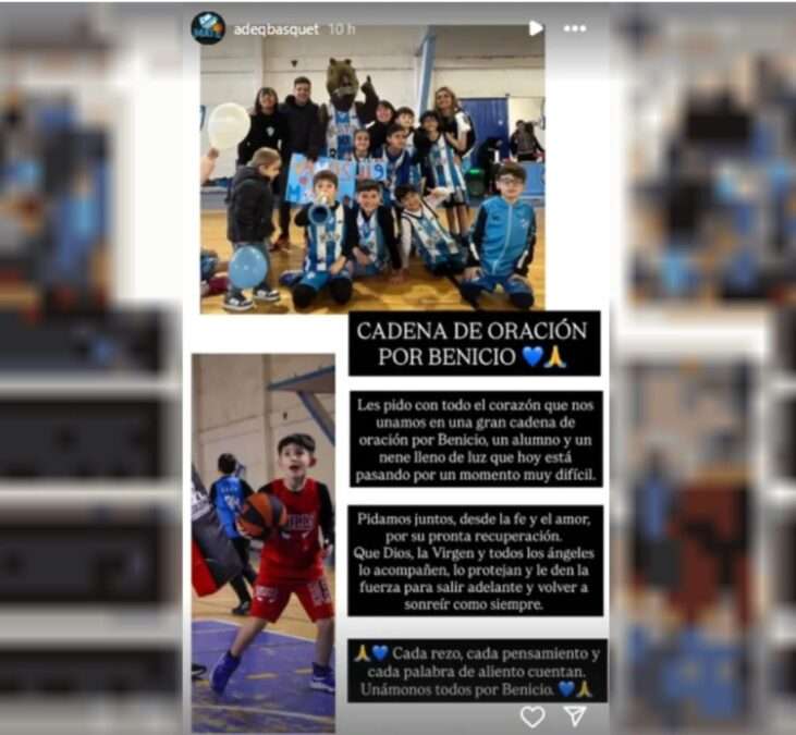 “Les pido con todo el corazón que nos unamos en una gran cadena de oración por Benicio, un alumno y un nene lleno de luz que hoy está pasando por un momento muy difícil. Pidamos juntos, desde la fe y el amor, por su pronta recuperación. Que Dios, la Virgen y todos los ángeles los acompañen, lo protejan y le den la fuerza para salir adelante y volver a sonreír como siempre”, expresaron.