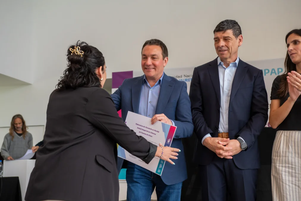El jefe comunal, Andrés Watson, junto a la titular del Ministerio de Mujeres y Diversidad Estela Díaz, encabezó el acto de colación que reconoció a quienes culminaron la trayectoria pedagógica impulsada por el gobierno bonaerense, el viernes en la Universidad Nacional “Arturo Jauretche”.