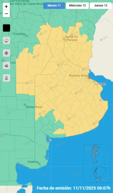 Un frente frío proveniente de la Patagonia avanza sobre la región central de Argentina, provocando un brusco cambio de tiempo. El Servicio Meteorológico Nacional (SMN) ha emitido una alerta amarilla por tormentas fuertes que afecta a 13 provincias y a la Ciudad de Buenos Aires.