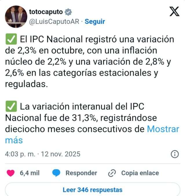 En su cuenta de la red social X, el ministro de Economía, Luis Caputo, hizo un análisis positivo de estos números. “La variación interanual del IPC Nacional fue de 31,3%, registrándose 18 meses consecutivos de desaceleración en la comparación contra igual mes del año anterior. Esta variación interanual es la más baja desde julio de 2018. La inflación acumulada en los primeros diez meses del año fue de 24,8%, la menor para este período del año desde 2017 (19,4%).