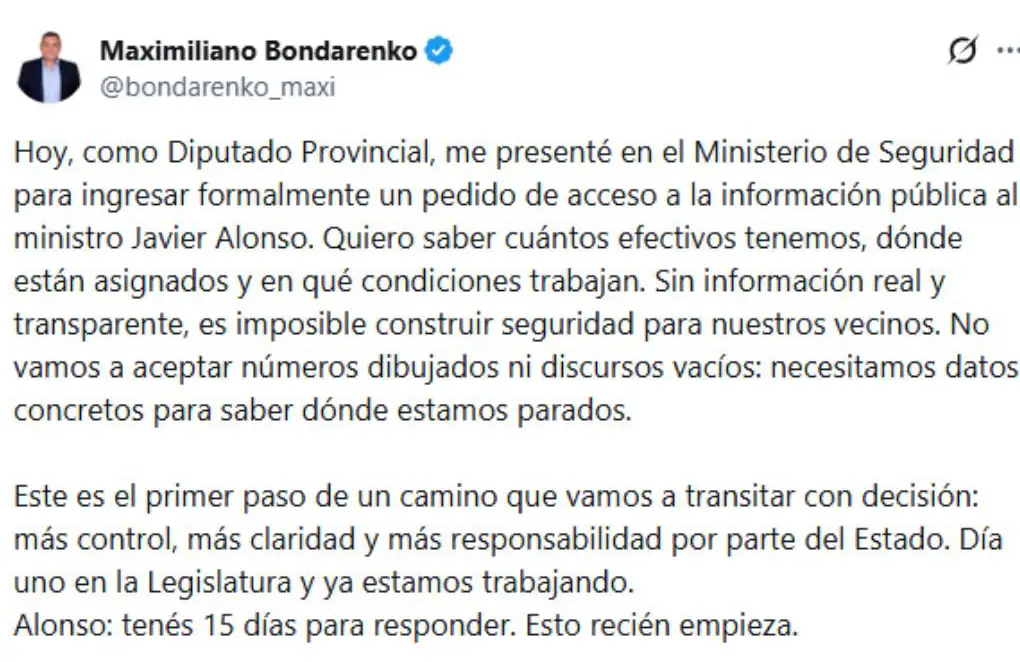 “Sin información real y transparente, es imposible construir seguridad para nuestros vecinos. No vamos a aceptar números dibujados ni discursos vacíos: necesitamos datos concretos para saber dónde estamos parados. Este es el primer paso de un camino que vamos a transitar con decisión: más control, más claridad y más responsabilidad por parte del Estado. Día uno en la Legislatura y ya estamos trabajando. Alonso: tenés 15 días para responder.