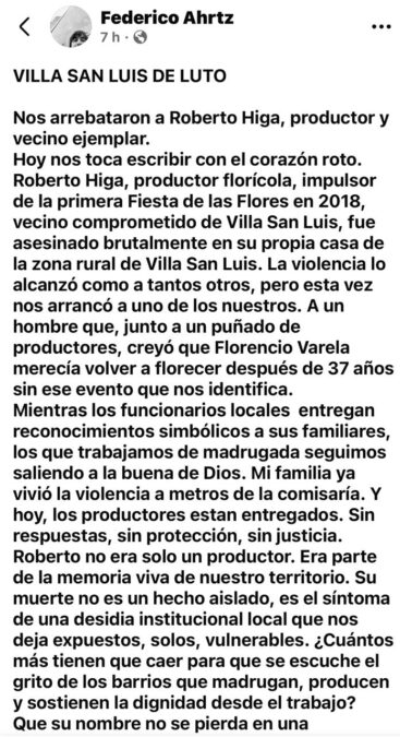 El vecino y profesional Federico Ahrtz posteo un conmovedor mensaje, tras el impacto que provocó en la comunidad toda la muerte del querido vecino Roberto Higa: