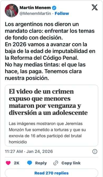 A través de un mensaje publicado en su cuenta de X, el titular de la Cámara baja sostuvo que la reforma es necesaria para garantizar que «el que las hace, las paga», reafirmando uno de los pilares discursivos del Gobierno nacional en materia de seguridad.__