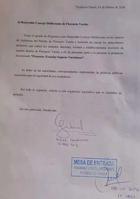 «La referente política de La Libertad Avanza, Silvina Grinkievich, ex consejera escolar, se presentó hoy en el Honorable Concejo Deliberante de Florencio Varela para presentar el proyecto «Escuelas Seguras Varelenses». Este proyecto, que ya había sido presentado en el Consejo Escolar en 2024 sin obtener respuesta, busca mejorar la seguridad en las escuelas del distrito», se informo a través de un comunicado de prensa.