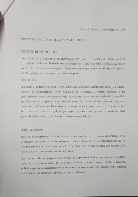 El proyecto «Escuelas Seguras Varelenses», que fue publicado por La Colmena (24 de noviembre 2024) , busca mejorar la seguridad en las escuelas de Florencio Varela a través de la coordinación entre el Estado Municipal, autoridades escolares, policiales, padres, comerciantes y vecinos. El objetivo es prevenir delitos y proteger a alumnos, docentes y edificios escolares mediante un programa de prevención, vigilancia y seguridad integral», finalizó el comunicado.