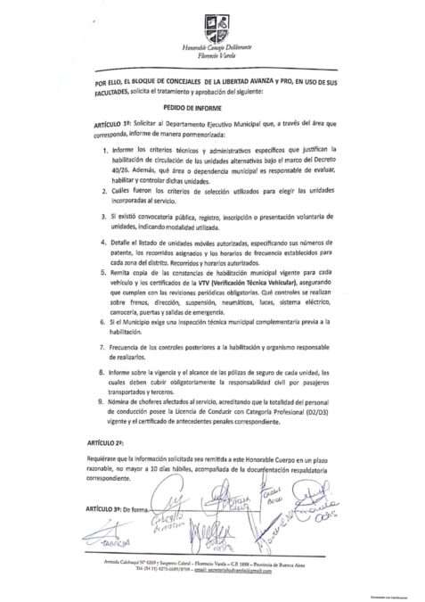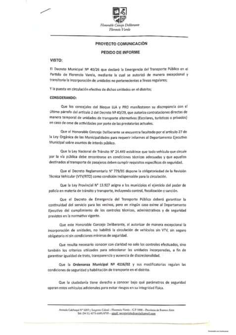 (04/02/2026 21:12 Los ediles de Concejales de Florencio Varela de La Libertad Avanza (LLA) y del PRO presentaron de manera conjunta un pedido de informes dirigido al Departamento Ejecutivo Municipal ante la preocupante y persistente situación que atraviesa el sistema de transporte en la ciudad.