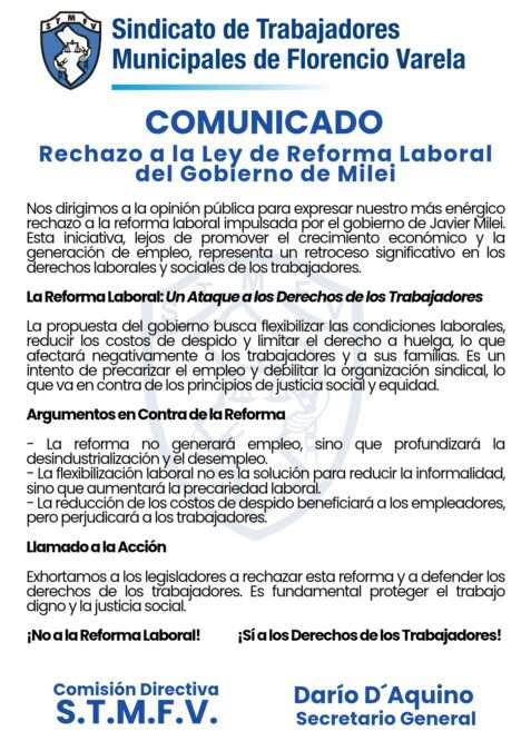 “Nos dirigimos a la opinión pública para expresar nuestro más enérgico rechazo a la reforma laboral impulsada por el gobierno de Javier Milei. Esta iniciativa, lejos de promover el crecimiento económico y la generación de empleo, representa un retroceso significativo en los derechos laborales y sociales de los trabajadores”, según se dio a conocer a través de un comunicado de prensa del STMFV.