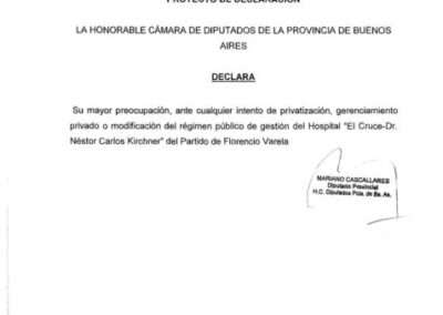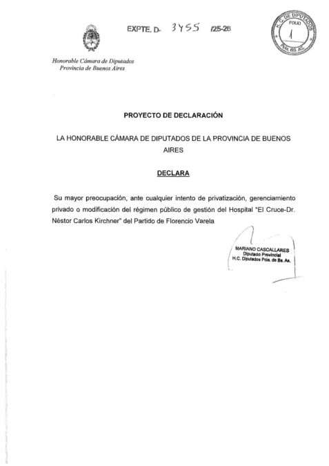 En ese marco, Cascallares impulsó una manifestación institucional del cuerpo legislativo bonaerense para dejar sentada una posición clara frente a cualquier avance privatizador, al dejar escrita su “preocupación ante cualquier intento de privatización del nosocomio”, y subrayar la importancia de sostener la “continuidad del régimen público de gestión del Hospital El Cruce – Dr. Néstor Carlos Kirchner, y señalar que se trata de un establecimiento estratégico dentro del entramado sanitario tanto provincial como nacional.