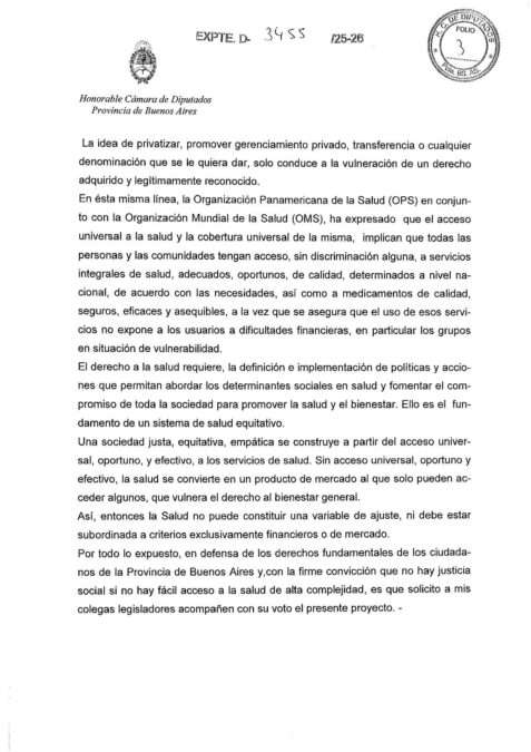 De este modo, la iniciativa parlamentaria se inscribe en una estrategia de resguardo del sistema público de salud y de los hospitales que lo integran, frente a escenarios que podrían derivar en procesos de privatización o gerenciamiento privado, con consecuencias directas sobre el acceso, la equidad y la calidad de la atención médica.
