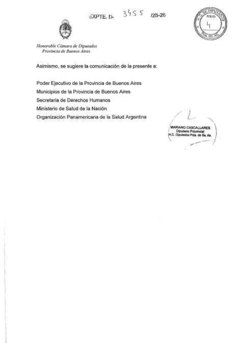 Además de fijar posición, el proyecto de Cascallares sugiere la comunicación formal de la declaración a distintos organismos e instituciones, al tiempo que propone dar intervención al Poder Ejecutivo de la provincia de Buenos Aires, a los municipios bonaerenses, a la Secretaría de Derechos Humanos y al Ministerio de Salud de la Nación, con el objetivo de ampliar el alcance institucional del pronunciamiento.