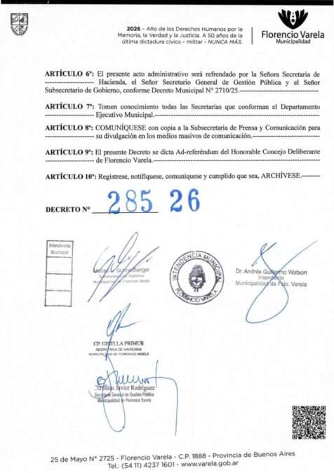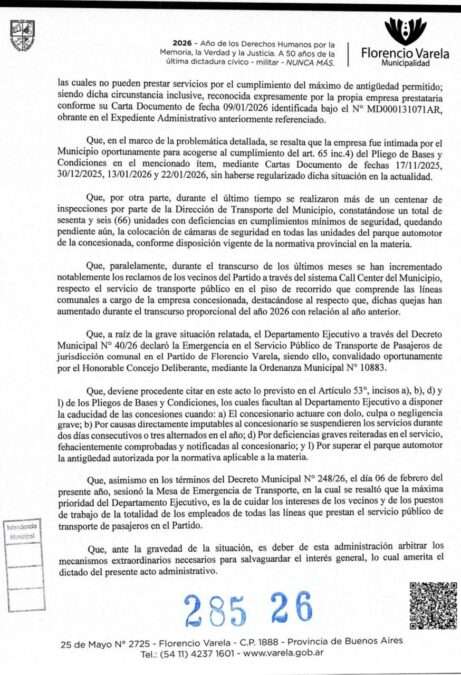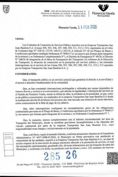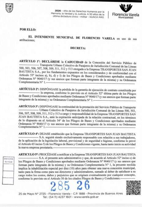 Un mes después de formalizar el Estado de Emergencia del Transporte Público en el partido, a partir de la normativa 40/26 respaldada por el Honorable Concejo Deliberante en sesión extraordinaria, el Alcalde dictaminó la caducidad de la concesión a “Transportes San Juan Bautista S.A.”.