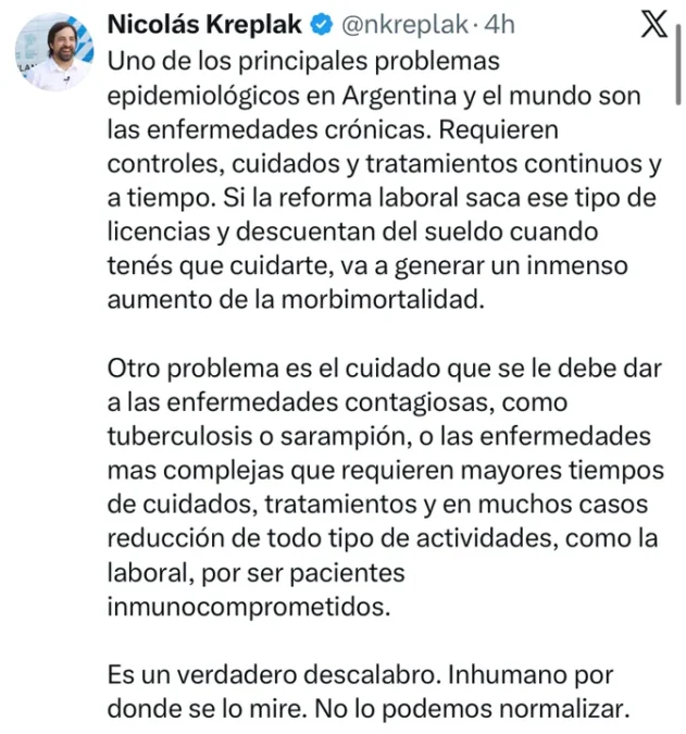 “Requieren controles, cuidados y tratamientos continuos y a tiempo. Si la reforma laboral saca ese tipo de licencias y descuentan del sueldo cuando tenés que cuidarte, va a generar un inmenso aumento de la morbimortalidad”, advirtió en X.