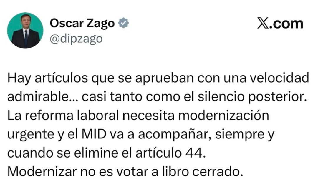 Y remarcó que “la reforma laboral necesita modernización urgente y el MID va a acompañar, siempre y cuando se elimine el artículo 44. Modernizar no es votar a libro cerrado”.