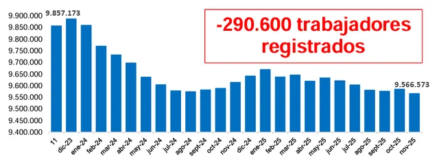 • Tomando el mismo período, el número de trabajadores que se perdieron escala hasta los 290.600, lo que implicó una reducción del 2,77%: pasó de 9.857.173 en noviembre de 2023 a 9.566.573 en noviembre de 2025.