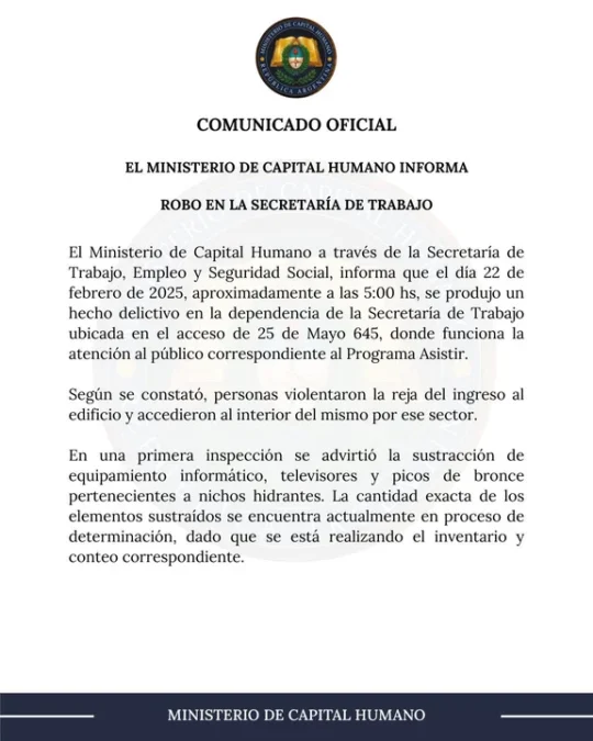 El Ministerio de Capital Humano informó, mediante un comunicado publicado en redes sociales, que hubo “un hecho delictivo” en la dependencia de la Secretaría de Trabajo, ubicado en el edificio situado sobre la calle 25 de Mayo 645.