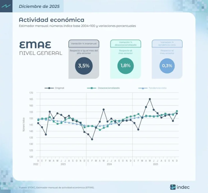 Tras cerrar el último mes del año con crecimiento, la actividad económica se incrementó un 4,4% durante el 2025, según informó el Instituto Nacional de Estadísticas y Censos (INDEC).