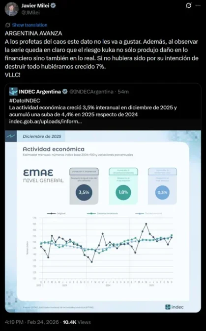 El presidente de la Nación, Javier Milei, destacó el avance de la actividad económica mediante sus redes. En el mismo, sostuvo que el EMAE hubiera crecido hasta el 7% de no haber sido por el “riesgo kuka”.