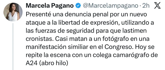 En contraposición, la periodista y diputada Marcela Pagano anunció que presentó una denuncia penal ante “un nuevo ataque a la libertad de expresión” y señaló que se utilizaron las fuerzas de seguridad “para que lastimen cronistas”: “Casi matan a un fotógrafo en una manifestación similar en el Congreso y hoy se repite la escena con un colega camarógrafo de A24”, añadió.