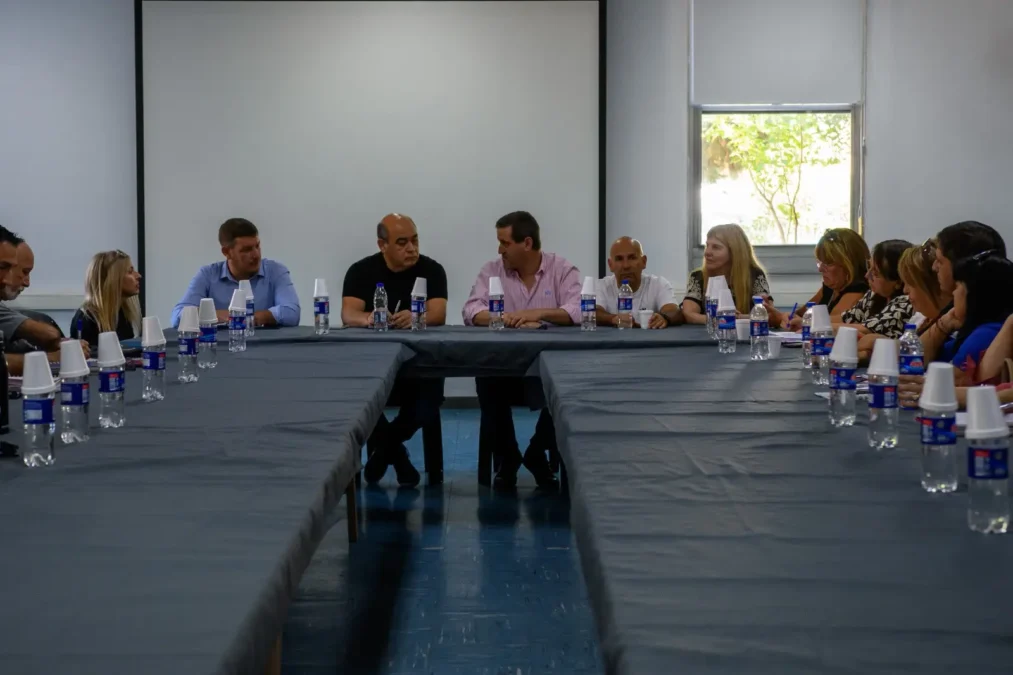 Integrantes del gabinete local, representantes del ámbito pedagógico y miembros de la Unión Educativa de Gestión Distrital, protagonizaron un encuentro para abordar el reordenamiento en la prestación de líneas de transporte público comunales, así como el traspaso del Servicio Alimentario Escolar (S.A.E) a la órbita municipal antes del comienzo del ciclo lectivo, durante el mediodía del viernes en el predio del ex establecimiento AGFA en barrio La Pileta.