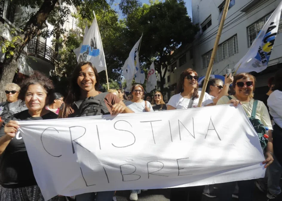 Un grupo de manifestantes con banderas de La Cámpora se desvió hacia el departamento de la ex presidenta Cristina Kirchner en el barrio de Constitución, donde la ex mandataria cumple su prisión domiciliaria por la causa Vialidad, y ella salió al balcón a saludar.