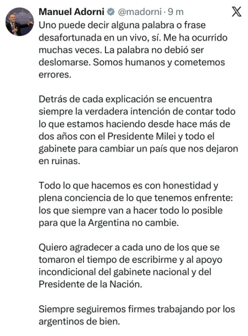 Adorni señaló que “todo lo que hacemos es con honestidad y plena conciencia de lo que tenemos enfrente: los que siempre van a hacer todo lo posible para que la Argentina no cambie. Quiero agradecer a cada uno de los que se tomaron el tiempo de escribirme y al apoyo incondicional del gabinete nacional y del Presidente”, añadió.