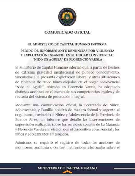 La investigación por explotación laboral y violencia infantil en el hogar convivencial “Nido de Águila” de Florencio Varela derivó en la detención de las responsables del establecimiento y el rescate de los menores en condiciones inhumanas. En las últimas horas, el Gobierno nacional se pronunció públicamente al respecto y desde el Ministerio de Capital Humano anticiparon que pedirán un detalle del control que se ejercía sobre el hogar.