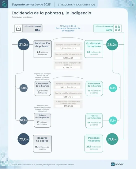 La pobreza alcanzó al 28,2% de las personas en el segundo semestre del 2025.