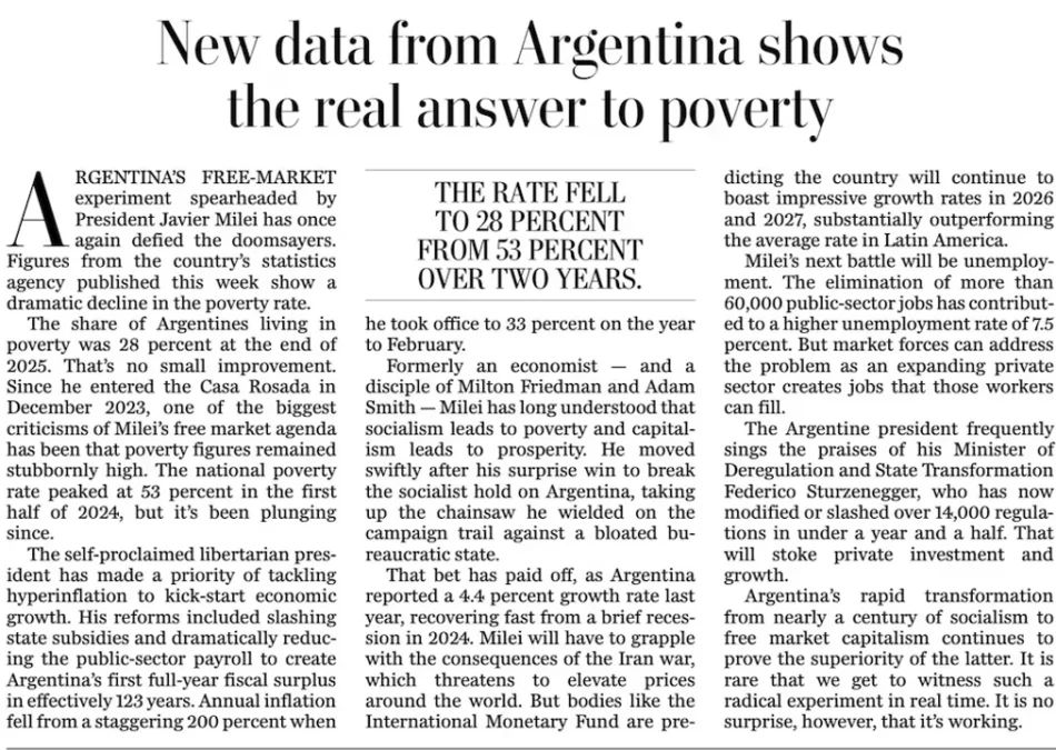 El diario estadounidense destacó que el giro hacia el libre mercado logró reducir la pobreza al 28% al cierre de 2025.