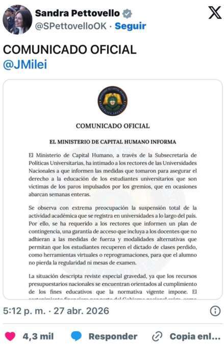 Desde la cartera que dirige Sandra Pettovello, mostraron preocupación por los paros de «semana completa» impulsados por los gremios universitarios, y pusieron énfasis en garantizar «el derecho a enseñar y aprender». No obstante, las agrupaciones sindicales que realizan un plan de lucha a nivel nacional reclaman al Ejecutivo el cumplimiento de la Ley de Financiamiento 27.795 ratificada por el Congreso y la Justicia y la recomposición salarial de docentes y no docentes, que estima una pérdida salarial del 50% en un año.