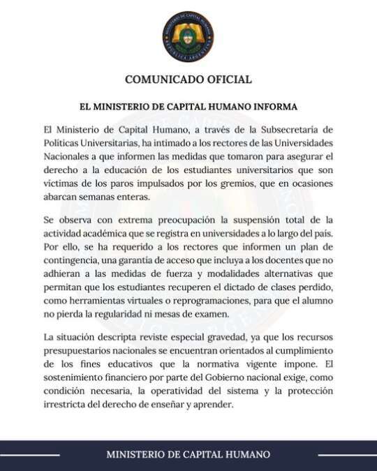 El Ministerio de Capital Humano solicitó a las autoridades de las universidades nacionales que envíe informes sobre las medidas que se tomaron durante las jornadas de paro docente y exigen que se recuperen jornadas perdidas y se garantice el ingreso de docentes que no adhieren a las medidas.